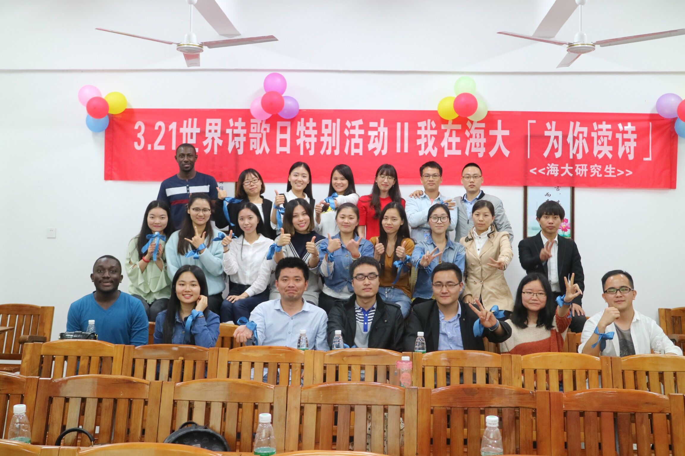 首先,由《海大研究生》编辑部成员依次为大家献声读诗,或深情、或欢快、或忧思、或激昂,让听众在这场听觉盛宴中流连忘返。接着,来自非洲加纳的留学生周一帆深受感染,为大家深情诵读《The Road Not Taken》;研究生赵飞飞也主动分享了一首原创小诗《你是十月的天堂》;研究生刘贤坤按耐不住创作灵感,即兴作诗与大家分享交流;文学院李樱同学作为资深诗歌爱好者,已经以“野有蔓草”的笔名,写了一本厚厚的诗集,活动之中她选取了一首小诗与大家共享。随后,肖为老师与大家把诗言欢,感受到大家对诗歌、对文字的热爱,激动之情溢于言表。马院研究生沈榕作为此次活动的倡导者,也与大家分享了她对诗歌的挚爱之情,她享受并感谢每一位诵诗者优美的声音、深情的诵读,并希望诗歌爱好者能够共度每一个世界诗歌日。此次活动,让诗歌爱好者们相聚一起,把诗言欢之时产生心灵之碰撞,感受中外诗歌之魅力,是一场心灵之旅,也是世界诗歌文化的交流与传承。