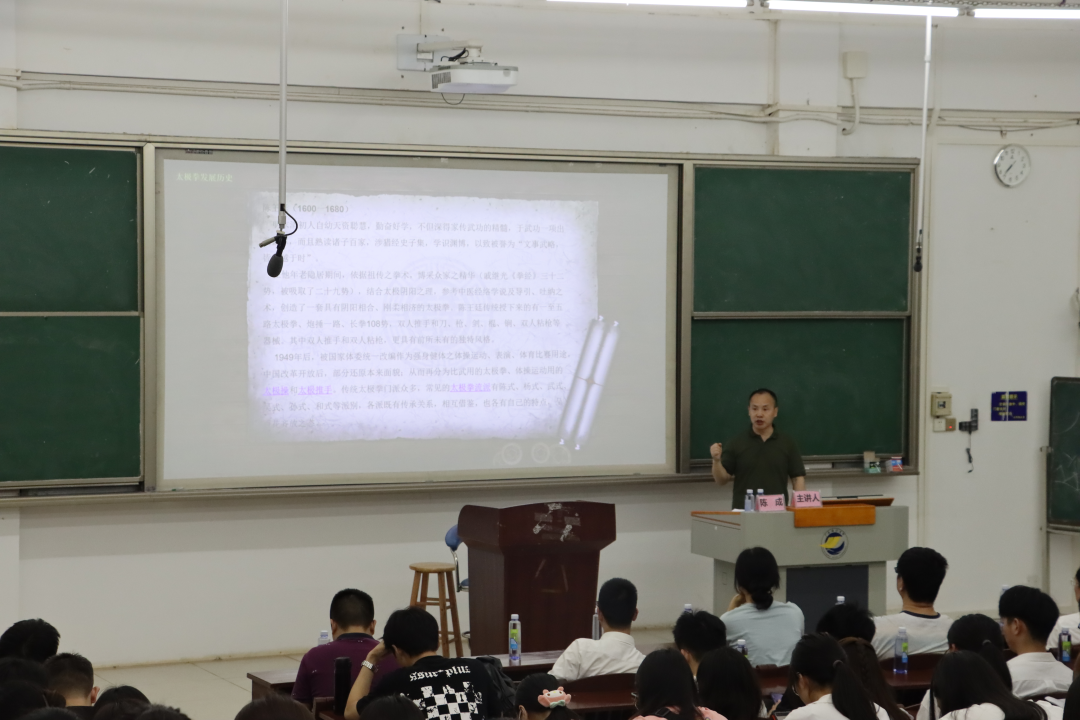 本次讲座,陈成老师从太极拳运动的历史与特点、中华儒释道文化传承概述和太极拳运动与身心健康三个方面展开讲解,他用通俗易懂的方式讲述中国传统文化理论、太极拳的起源与发展,用现场演示教学表现太极拳和日常生活的联系,简要介绍了陈氏太极拳的特点拳法等,讲解太极拳对身体的好处和长期锻炼的效果,他现场教学太极拳动作要领,传授日常训练的正确方法。他强调,青年学生应该多学习中国传统文化,更要重视身体素质的锻炼,太极拳不仅是一项运动,大家更应该在运动中收获健康和快乐。