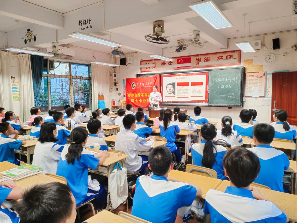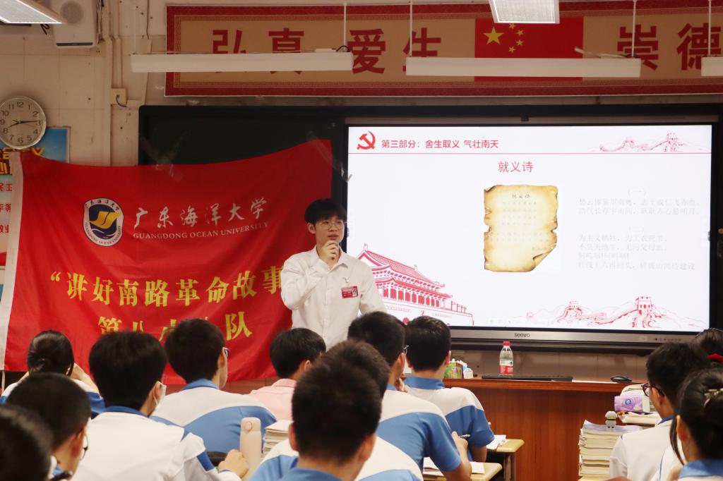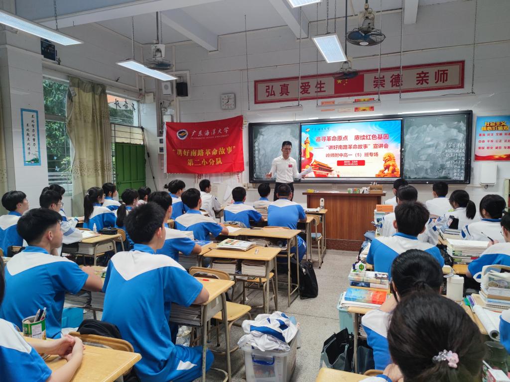 春风习习,队旗猎猎。在这最美的人间四月天,英国上市公司365“讲好南路革命故事”宣讲团80名师生,共十一支小分队,分别走进岭南师范学院附属中学39个班级展开了一场别开生面的红色“大思政课”,受众学生达2200多人。活动中,“讲好南路革命故事”宣讲团成员们为附中学子深情讲述了南路革命英雄黄学增、黄广渊、彭中英、钟竹筠、黄明德等十八名英雄人物的感人故事。为了激发学生对红色“大思政课”的热情,“讲好南路革命故事”宣讲团成员们通过图文并茂的方式生动地讲述了南路革命概况,重点介绍了南路英烈们的革命事迹和精神,引发了附中学子们浓厚的兴趣和共鸣,为在场师生们带来了一场鲜活而深刻的党史教育思政课。