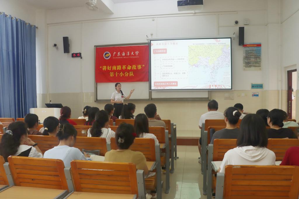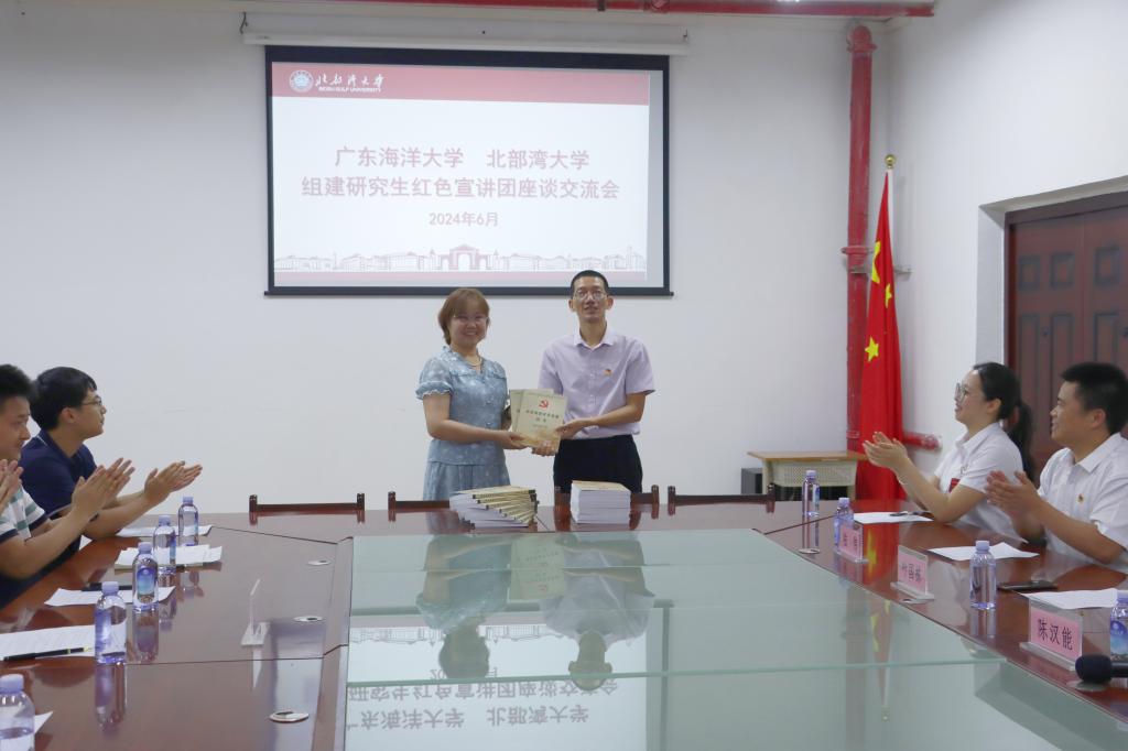 宣讲团师生一行还来到北部湾大学开展红色文化交流和宣讲活动。在红色文化交流会上,陈汉能向与会师生分享了教育部高校思想政治工作精品项目阶段性研究成果,北部湾大学英国上市公司365院长刘琼、马克思主义学院副院长何良俊和校团委副书记张飞分别就弘扬地方红色文化、题材挖掘、育人特色和双方在人才培养交流与合作等方面做了交流发言,叶国栋代表宣讲团向北部湾大学赠送了《讲好南路革命故事读本》。