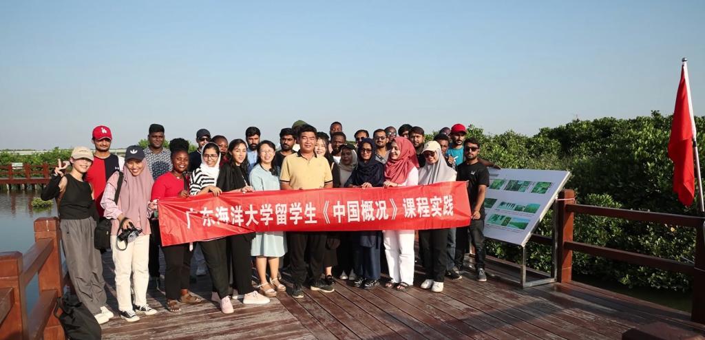 许何昌带领师生一行参观了金牛岛红树林片区,学习了解了红树林种类和生态保护科普知识。随后,师生一同乘船游览了湛江红树林国家级自然保护区的旖旎风光,郭玉华老师就此作了关于习近平总书记粤西考察足迹、中国人海和谐理念、红树林国家级自然保护区等专题的现场教学。参加活动的留学研究生纷纷表示,此次课外实践活动收益良多,既感受到了中国对海洋生态保护的重视,又增进了对中国海洋事业的了解以及对涉海专业的学科自信。