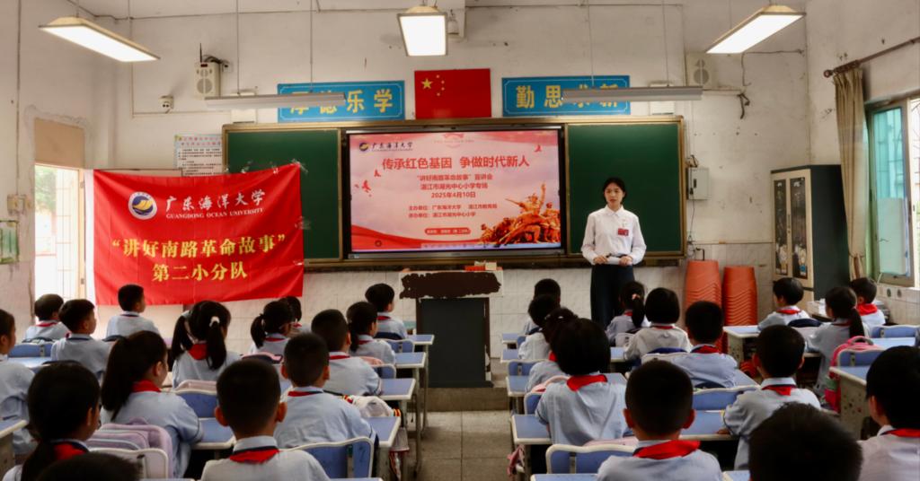 作为学校构建“红蓝绿”大思政育人格局中“以红色基因打底色”的重要内容,“讲好南路革命故事”既是擦亮党建特色的品牌工程,更是通过革命叙事启智润心、培根铸魂的育人实践。活动中,陈关怡副院长代表宣讲团向湖光中心小学赠送《讲好南路革命故事读本》,为红色教育注入鲜活教材。42名大学生宣讲员构建“多维宣讲矩阵”,依托革命文物图片、情景演说、互动问答等形式,在36个班级同步开讲南路革命先驱黄学增、南路“江姐”钟竹筠等南路革命先辈的革命理想、家国情怀等史诗般的故事。通过“行走的红色课堂”,将“南路星火”化作可触可感的成长养分。