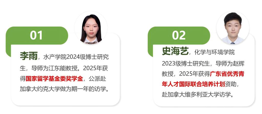 扎实推进研究生培养国际化进程,搭建多维度的国际交流平台。水产学院2024级博士生李雨成功获得国家留学基金资助,赴加拿大约克大学访学。化学与环境学院2023级博士生史海艺同学获广东省优秀青年人才国际联合培养计划资助,赴加拿大维多利亚大学访学。近年来,学校积极构建国际化研究生人才联合培养平台,通过“走出去”加深对世界高水平大学的办学认识,助推国际知名海洋大学建设。