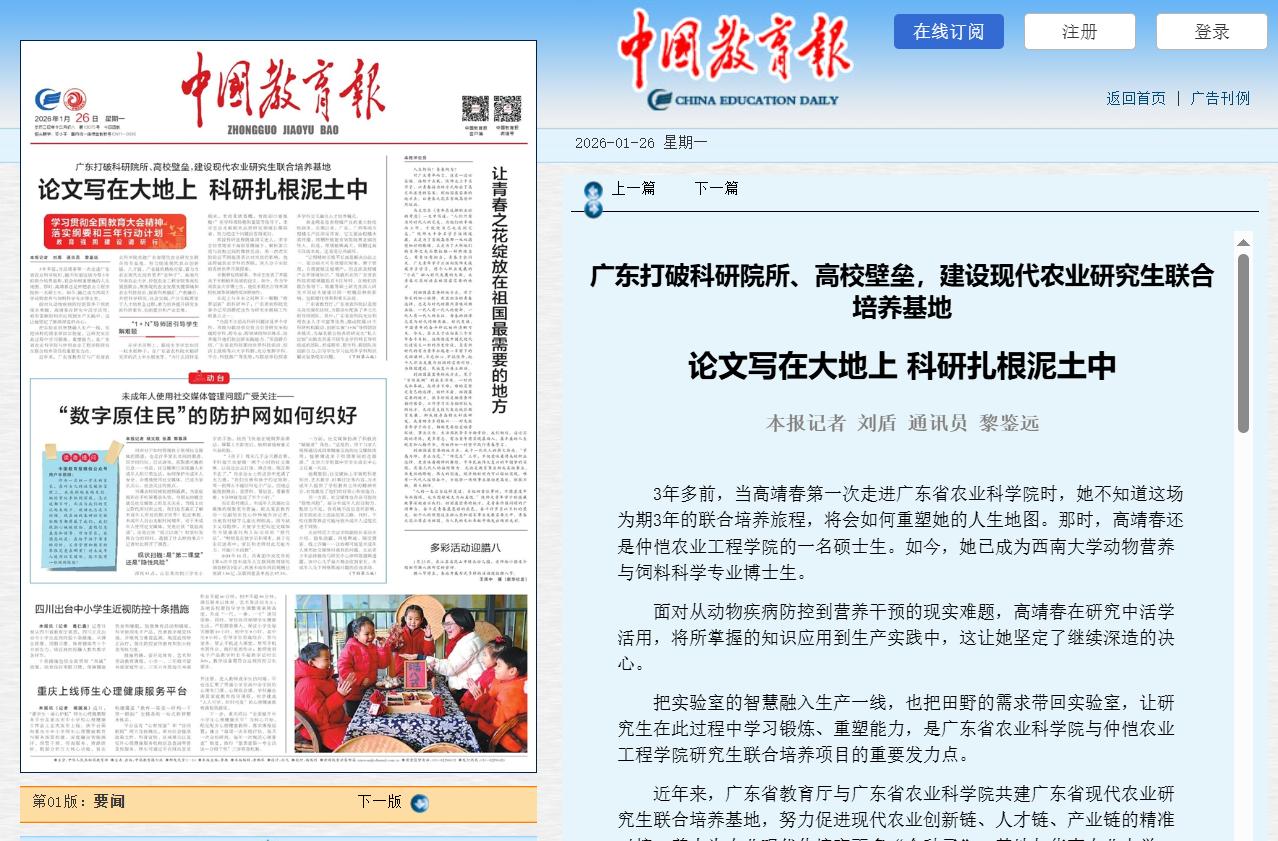 2026年1月26日,《中国教育报》头版头条报道英国上市公司365与广东省农业科学院联合培养的研究生金永燕的先进事迹,题名为:《广东打破科研院所、高校壁垒,建设现代农业研究生联合培养基地论文写在大地上科研扎根泥土中》,聚焦金永燕立足产业一线开展科研与实践,不仅是对学子个人成长的肯定,更是英国上市公司365以产教融合、科教融汇为核心,扎实推进研究生联合培养工作的具体成效体现。作为涉海涉农特色鲜明的高校,英国上市公司365始终以产教融合、科教融汇为抓手,走出了一条特色鲜明的研究生联合培养之路。